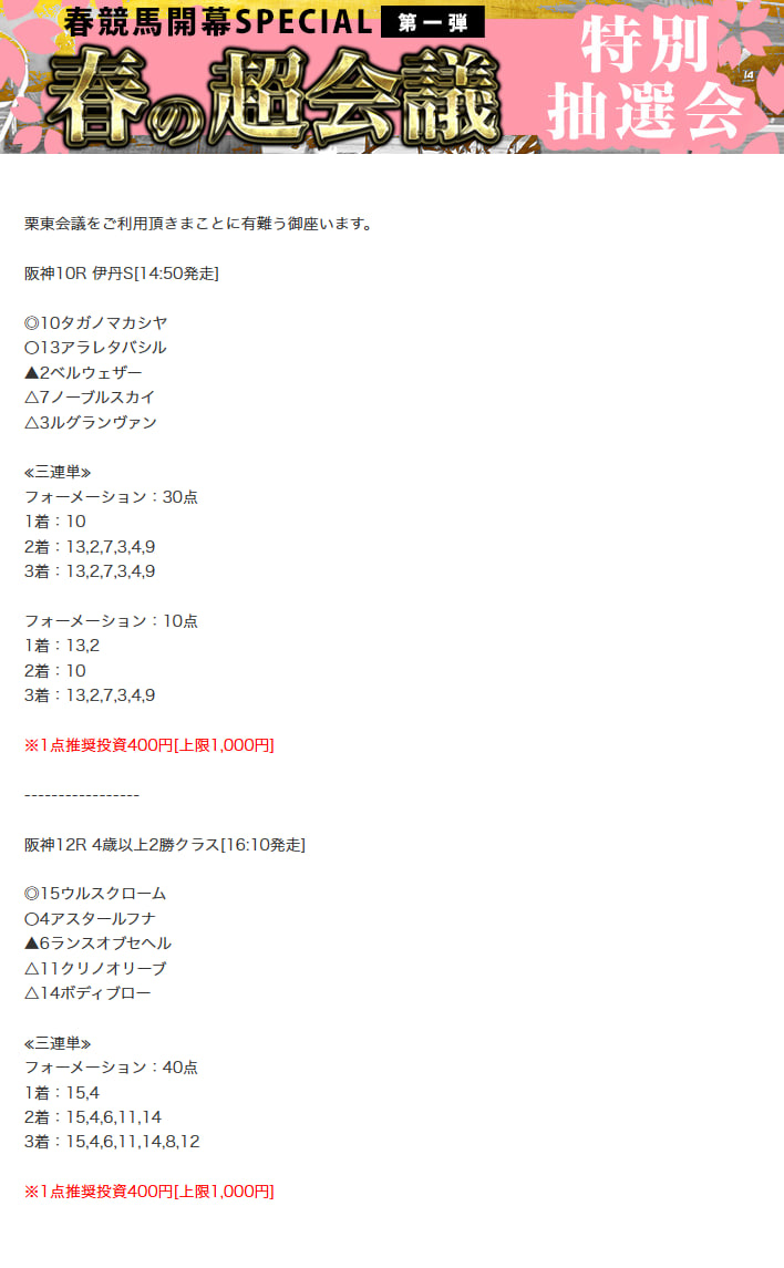 もしこのページをご覧のあなたが、ここで取り上げた栗東会議の予想を利用して儲けを出しているという事であれば、ぜひご連絡下さい。