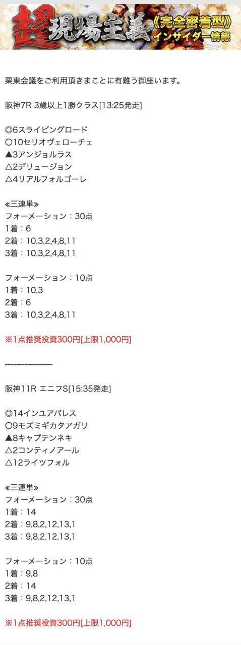 栗東会議の予想を利用して儲けたという人はぜひ、口コミを買い取らせて下さい。