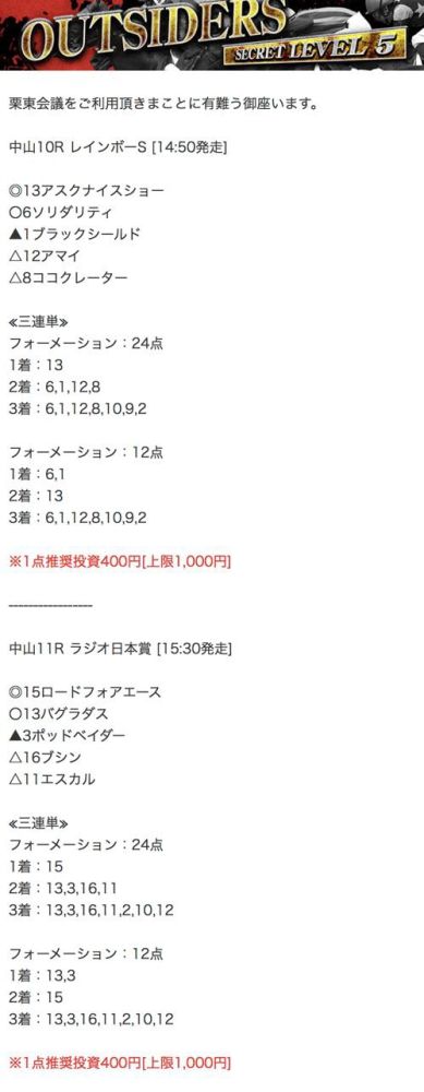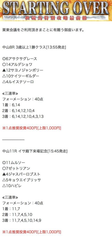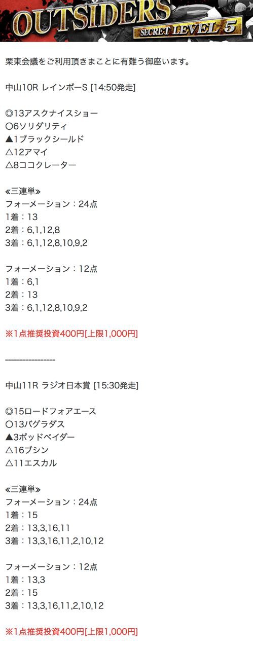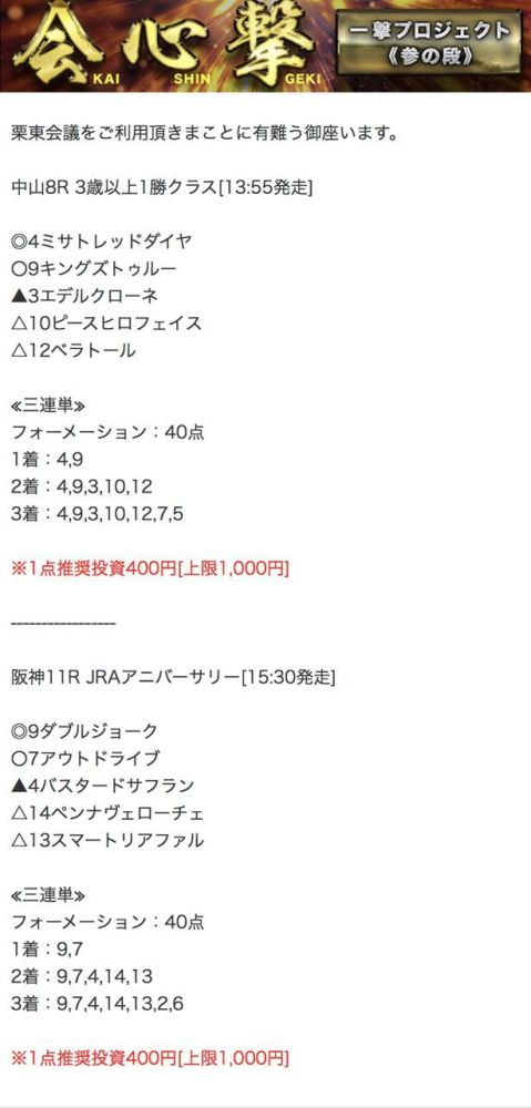 もしこのページをご覧のあなたが、ここで取り上げた栗東会議の予想を利用して儲けを出しているという事であれば、ぜひご連絡下さい。