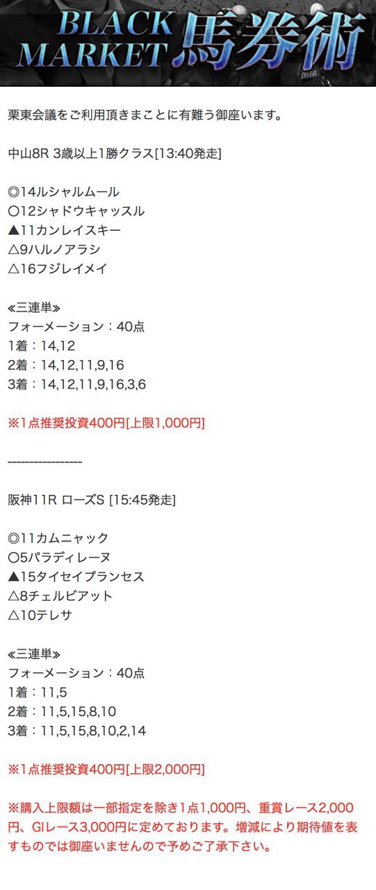 有料予想(レギュラープラン及び複数のキャンペーンプラン)を利用した方からの口コミ評価レビューです。合計15鞍の買い目提供を受け、その結果どれくらいの利益を得ることができたのか?その体験談を無償で公開中です。