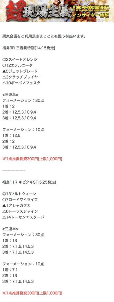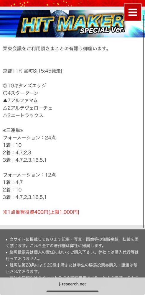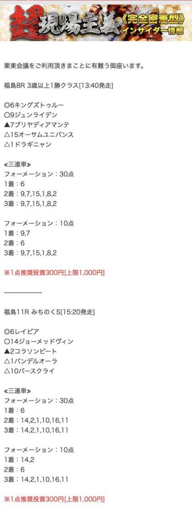 もしこのページをご覧のあなたが、ここで取り上げた栗東会議の予想を利用して儲けを出しているという事であれば、ぜひご連絡下さい。