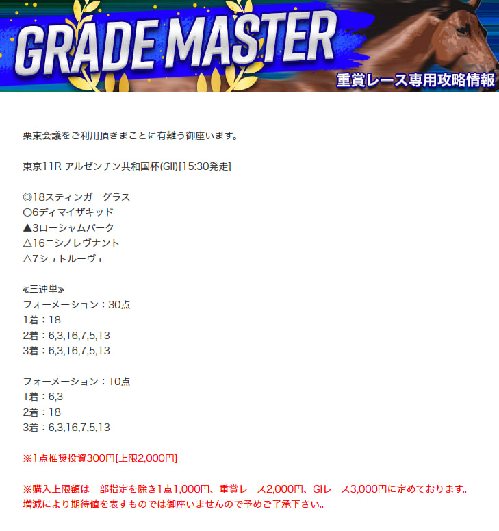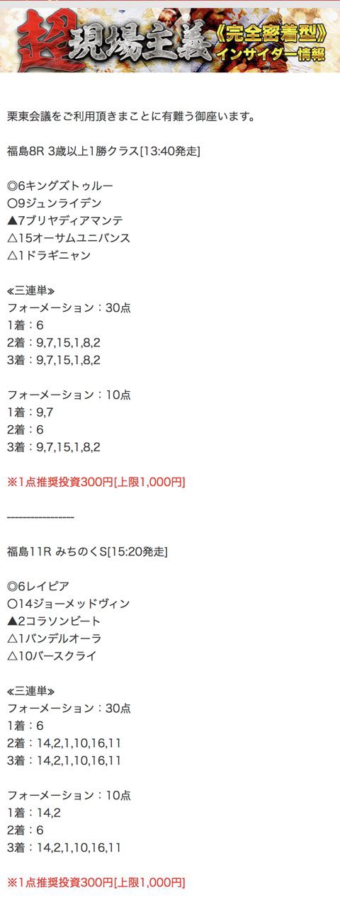 また栗東会議では、会員ページにおいて現役の競馬関係者が東西トレセン・競馬場・牧場等で仕入れた情報をユーザーに提供すると謳っています。