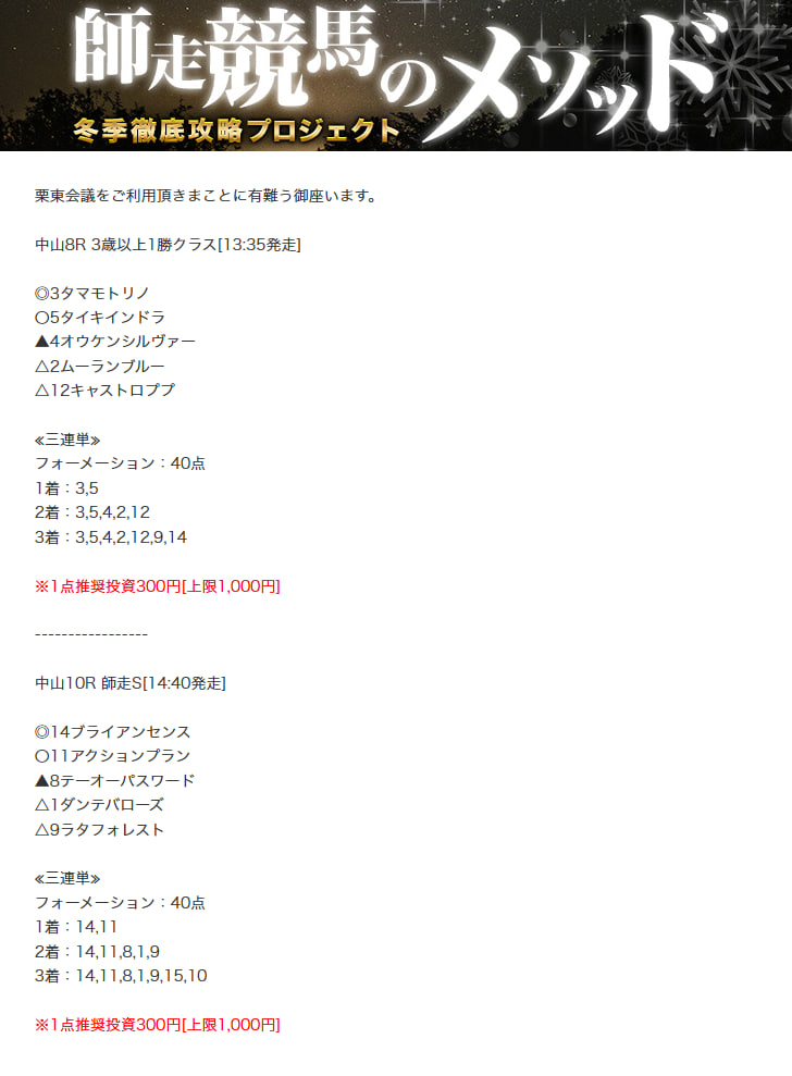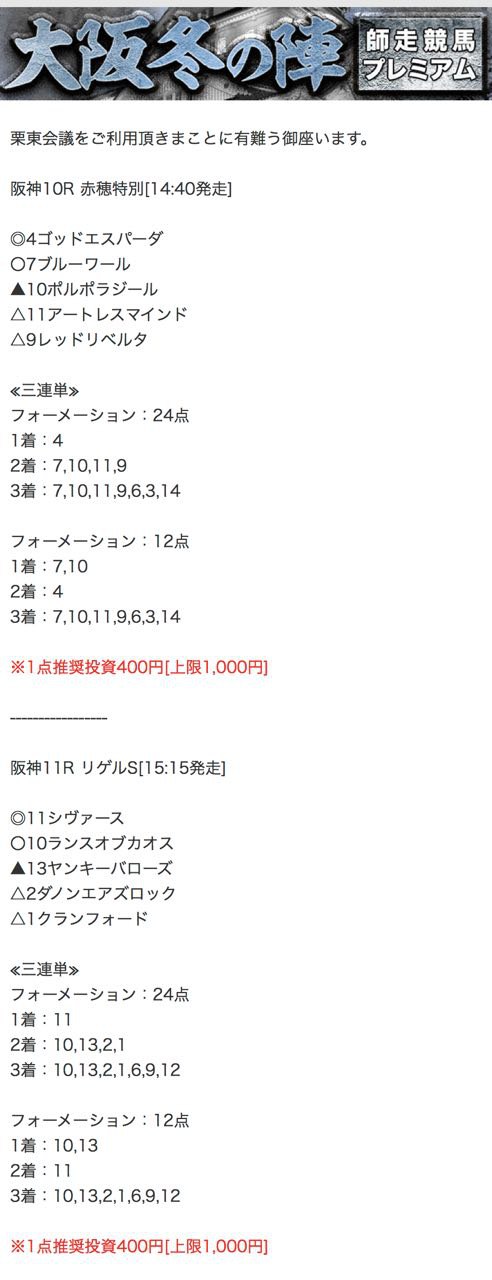 栗東会議の予想を利用して儲けたという人はぜひ、口コミを買い取らせて下さい。