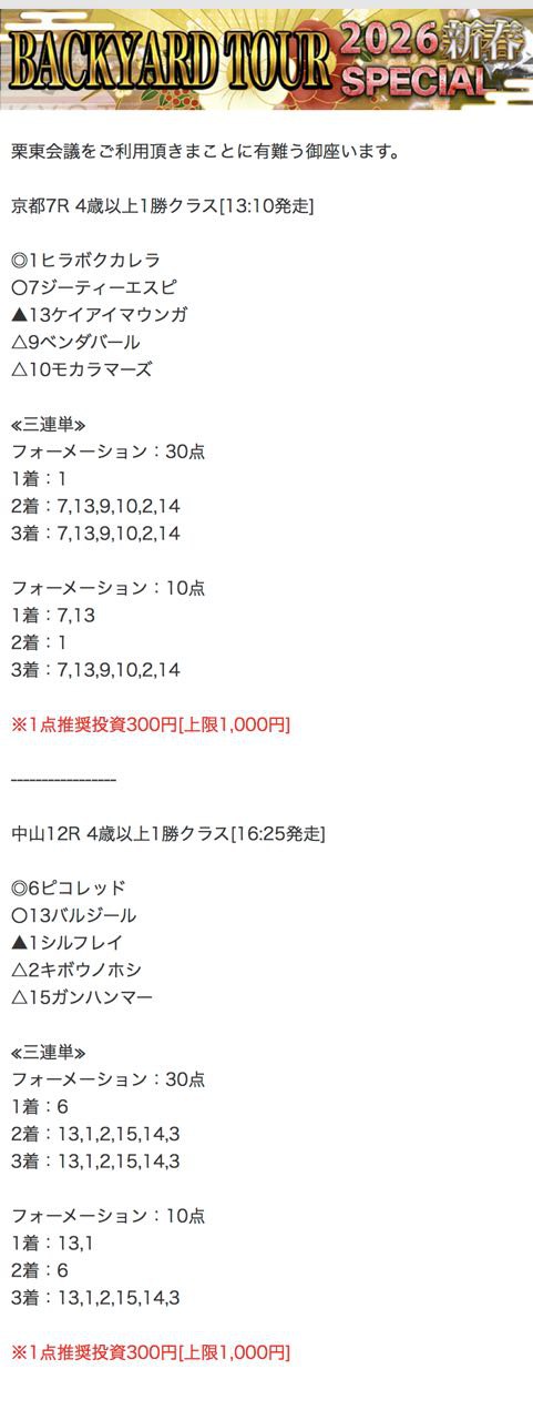 バックヤード買い目です
